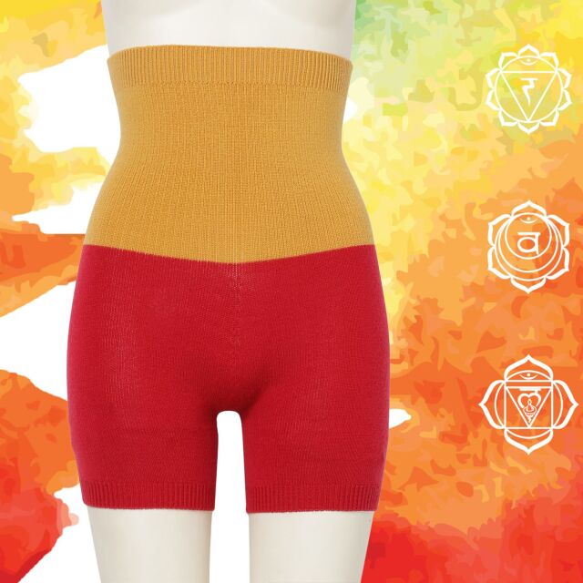 新・シルクウールオーバーパンツが進化した点、それは、チャクラカラーで元氣になる魔法をかけたこと。ド派手でビックリする色合いですが、ちゃんと理由があるのです。皆様ご存じのように、色も波長であり、色自体が発する波長に私たちは影響を受けます。そして、赤やオレンジ色は、赤外線寄りの波長であり、見た目の暖かさだけではなく、実際に波長として暖かさを与えます。身体を温めるインナーとして最適な色でもあります。