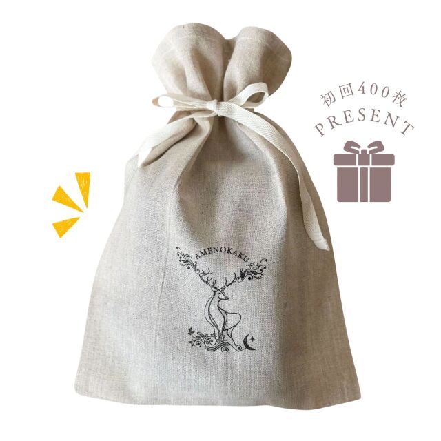 初回限定400名様まで!今なら、AMENOKAKUマーク入りの巾着ポーチをプレゼント!素材は嬉しいリネンコットン。巾着はリボンのように結ぶタイプですので、プレゼントにも最適です。バッグインバッグの巾着として、ご旅行用の下着入れなどにもお使いいただけます。