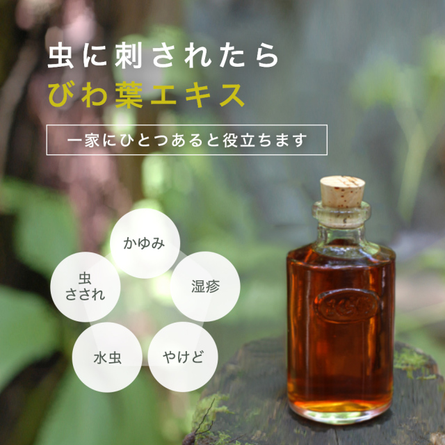 このエキスは、天然成分のみを使用し、防腐剤や香料などの添加物は一切使っていません。安心してお使いいただける無添加の手作りエキスです。また、最近になって改めて、さくら堂さんのびわ葉エキスに使われているびわの葉の素晴らしさを知る機会がありました。びわの葉であれば何でもいい訳ではなく、農薬を使用していないことはもちろん、葉の大きさ、肉厚、生命力、産地、これらを吟味して、さくら堂さんが納得したびわ葉だけを使用して作られています。つまり、エネルギーが高いのです。