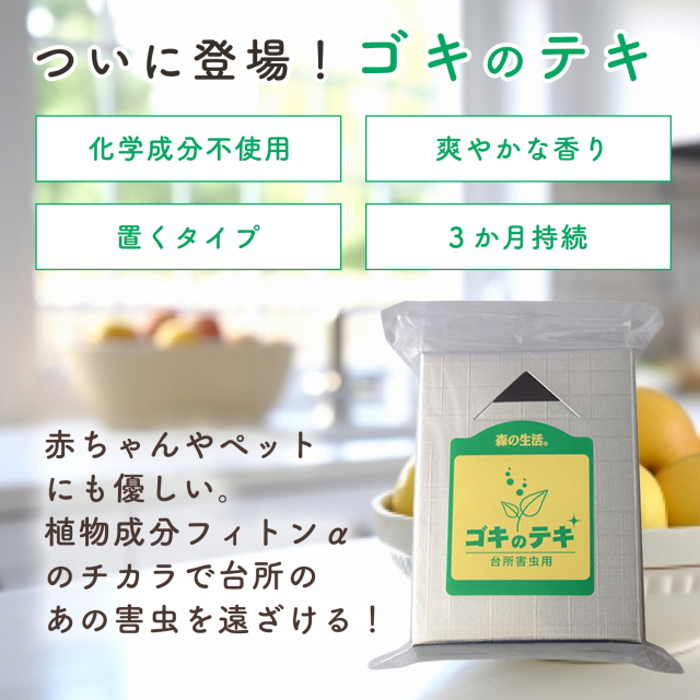 キッチンには害虫が出やすいですが、化学薬品の虫よけを使いたくないという人も多いですよね。特にスプレータイプの殺虫剤。あの頑丈な害虫を動けなくする強力な成分が食器や食材にかかってしまったとしたら。ペットや赤ちゃんが這ったり舐める床にかかってしまったとしたら。そう考えると、ブルブルっとしてしまいます。そして、置くタイプの害虫対策グッズは、小さなサイズのものも多く、お子様やペットが口に入れてしまう、という心配もありますが、ゴキのテキは手のひらサイズの箱タイプですし、化学合成成分不使用なので、小さなお子様やペットと暮らすご家庭も安心してお使いいただけます。また、ダニの増殖を抑える効果もあります。
