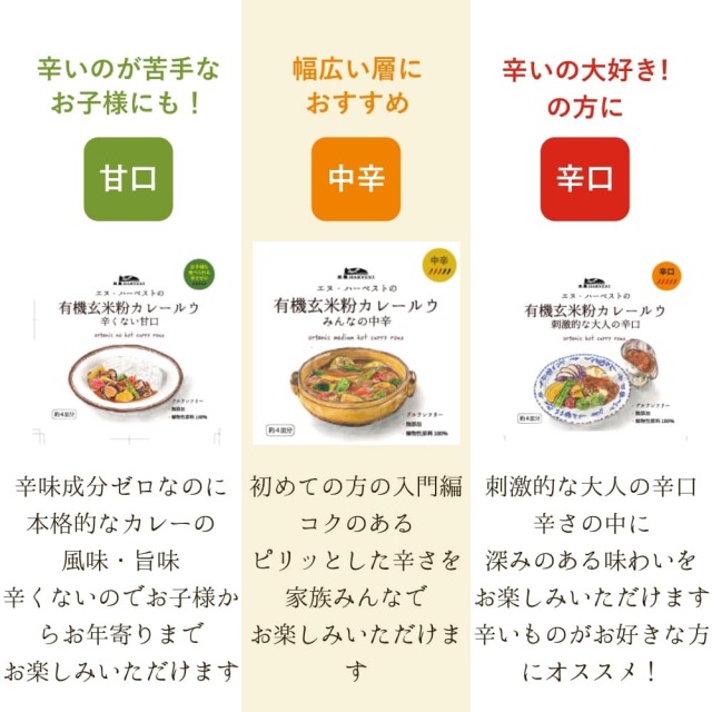 辛さのニーズに合わせて、3つの異なる味わいが楽しめるカレールウご用意しました。自分の好みに合わせて楽しむことができる味わい深いカレールウです。