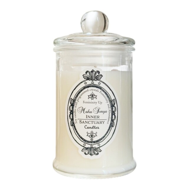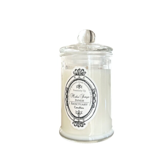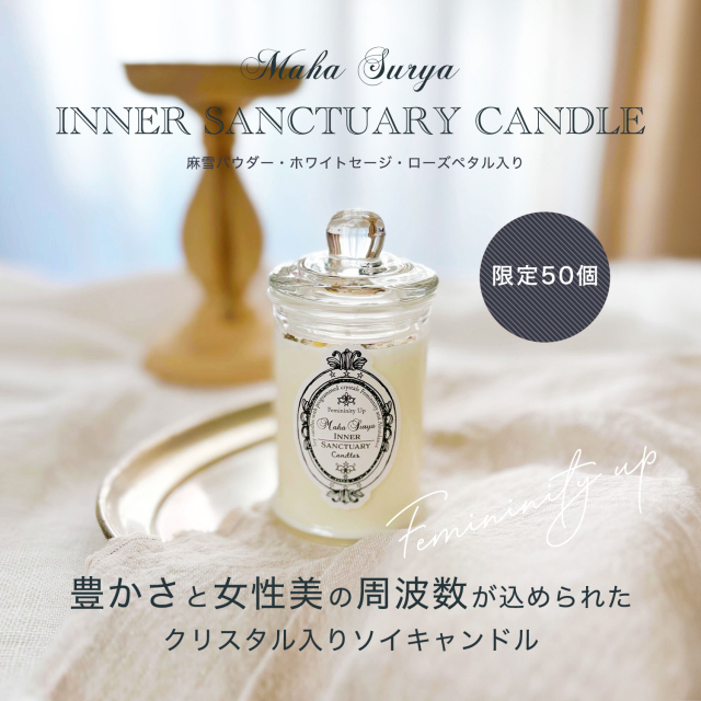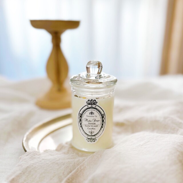 INNER SANCTUARY CANDLE by Maha Suryaはちょっと特殊なキャンドルです。ただ灯りを灯したり、インテリアを素敵に彩る為のキャンドル、というだけではないのです。それは一言で言えば、「灯すたびに心地良い周波数を感じることが出来るキャンドル」。INNER SANCTUARY CANDLEに使われているソイワックスには、周波数クリエイターSaya Ayakoさんにより、女性美や女性性アップの周波数が転写されています。また、キャンドルの中には、豊かさの周波数を転写したクリスタル(天然石)が入っています。その為、キャンドルを灯すことで、女性としての優しさや穏やかさを感じ、そして、精神的にも豊かな周波数を受けることができる為、自分をその波長に同調させることが出来ます。だから、自分はそのままで素晴らしいと思えるような幸福感に包まれるのです。以上の説明を「雲をつかむようなお話でよくわからない」と思われた方も、それで大丈夫です。このキャンドルは、何も考えなくても、香りや心地良さを楽しむことが出来ます。