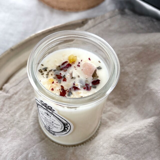 原材料: ソイワックス(女性性アップの周波数を転写)、精油、フランキンセンス樹脂、麻雪パウダー、ローズペタル、ホワイトセージ、コットン芯、プログラミングクリスタル(豊かさの周波数を転写)