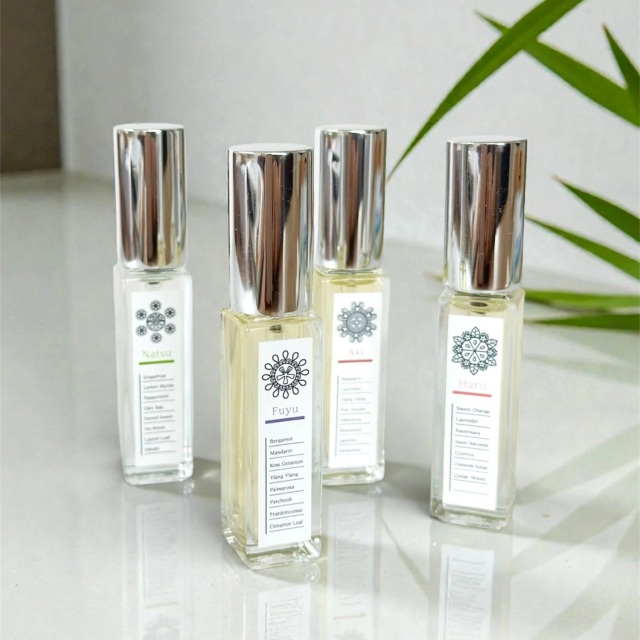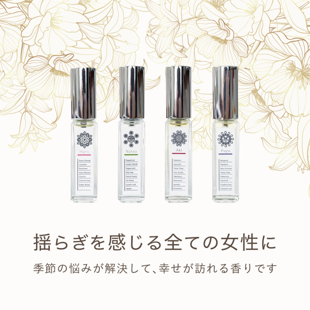 40代・50代になって更年期の揺らぎを感じている女性の方が、もっと毎日をイキイキと幸せに過ごせるように、「香りで感じる幸せ」を作りました。それは季節と共に前向きに生きやすくしてくれる、素敵な香りたちです。季節の揺らぎで不安定さを感じがちな春を爽やかに過ごせる香り、ただでさえ暑い夏、別の意味で汗や暑さが止まらない時に、氣持ち良さを感じさせる香り、長く感じる秋の夜、少しでもゆっくり長く、安心して休める香り、日が短くなって寂しさを感じやすく、氣分も落ち込みがちな冬には、明るい氣持ちを呼び起こす香り。どれもが揺らぎを感じる女性に優しく寄り添って、そっと前を向かせてくれます。全て更年期世代の女性の為に調合した香りです。元氣の出ない自分でも、不安定な自分でも、落ち込む自分でもいいじゃない!そんな自分も抱きしめたくなるくらい愛おしい!そんな風に思っていただけると嬉しいです。